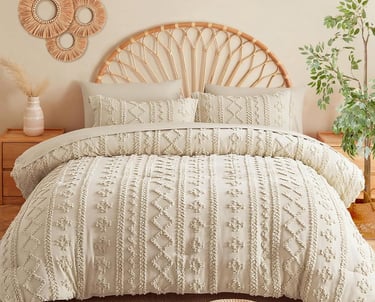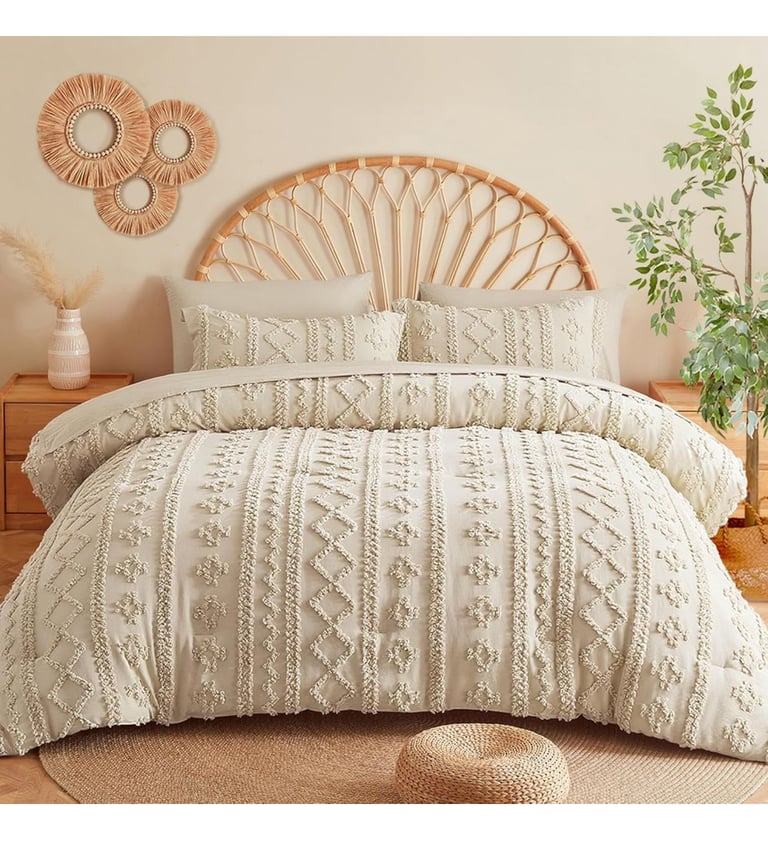 Transform your bedroom into a cozy boho retreat with this Queen-sized beige comforter set. Featuring a soft, tufted design, this bedding adds texture, warmth, and timeless style to any space. Perfect for layering or pairing with your favorite pillows and throws, it's a versatile addition to modern, bohemian, or farmhouse-inspired decor. Durable and easy to care for, this comforter set makes your bed look effortlessly stylish while keeping you comfy all night.