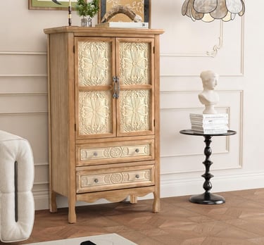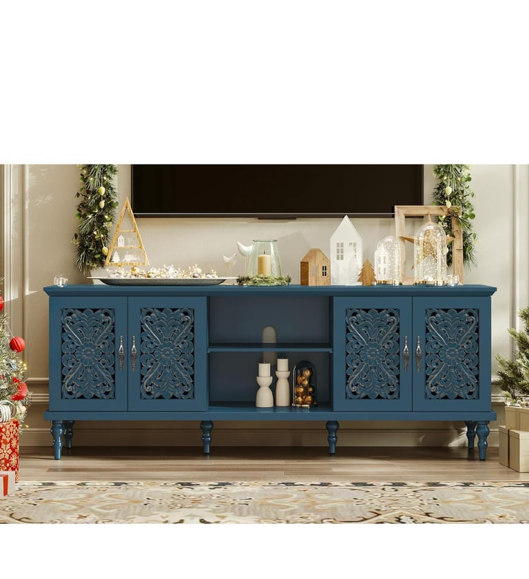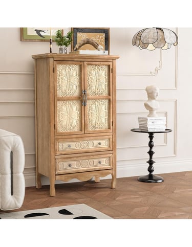The intricate hollow carved doors add texture and visual interest, creating an artisanal look that feels both elegant and inviting. Behind the detailed design, you'll find adjustable shelves that make organizing electronics, media accessories, books, or decor effortless - allowing you to customize the interior layout to fit your needs.